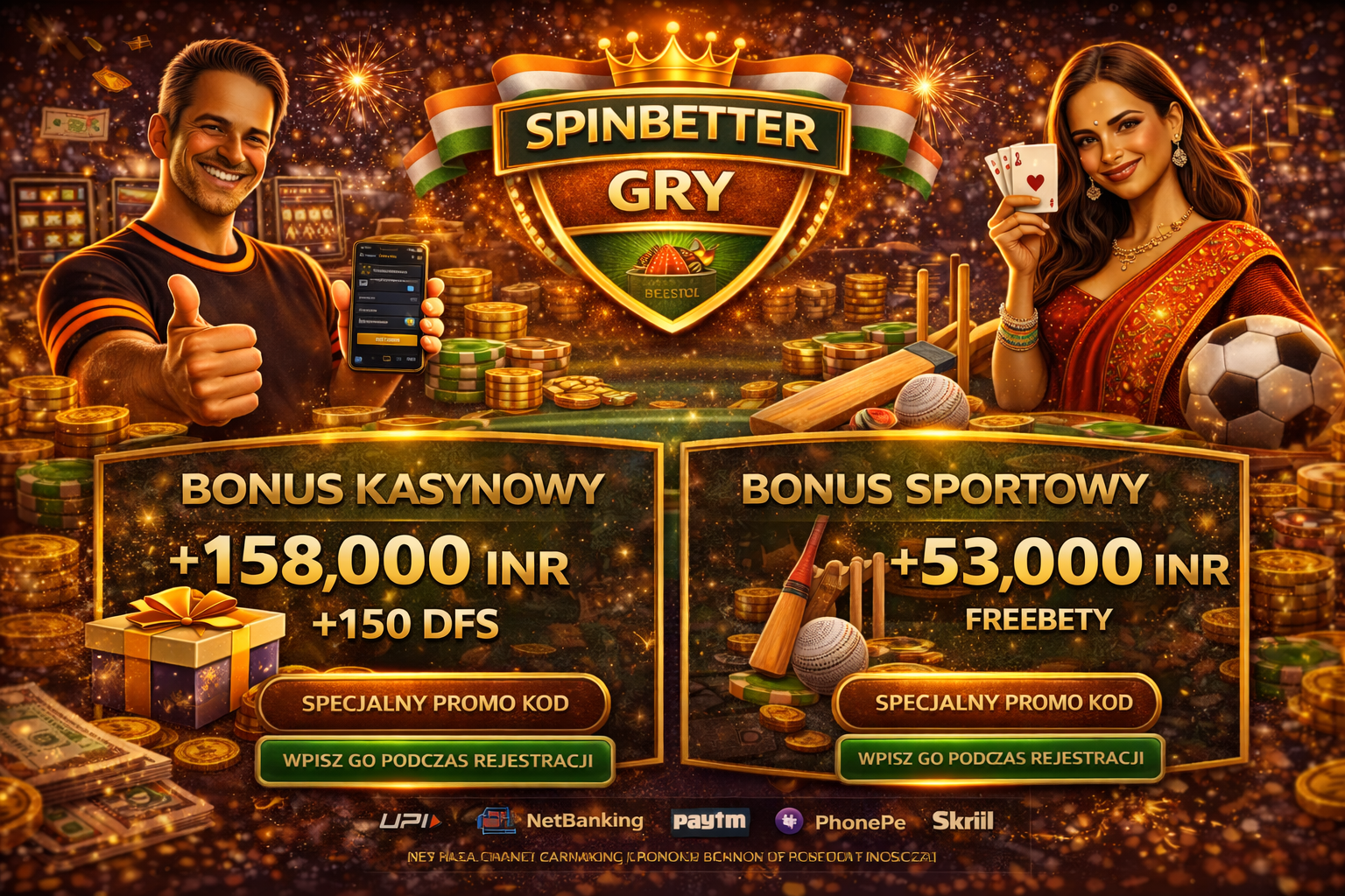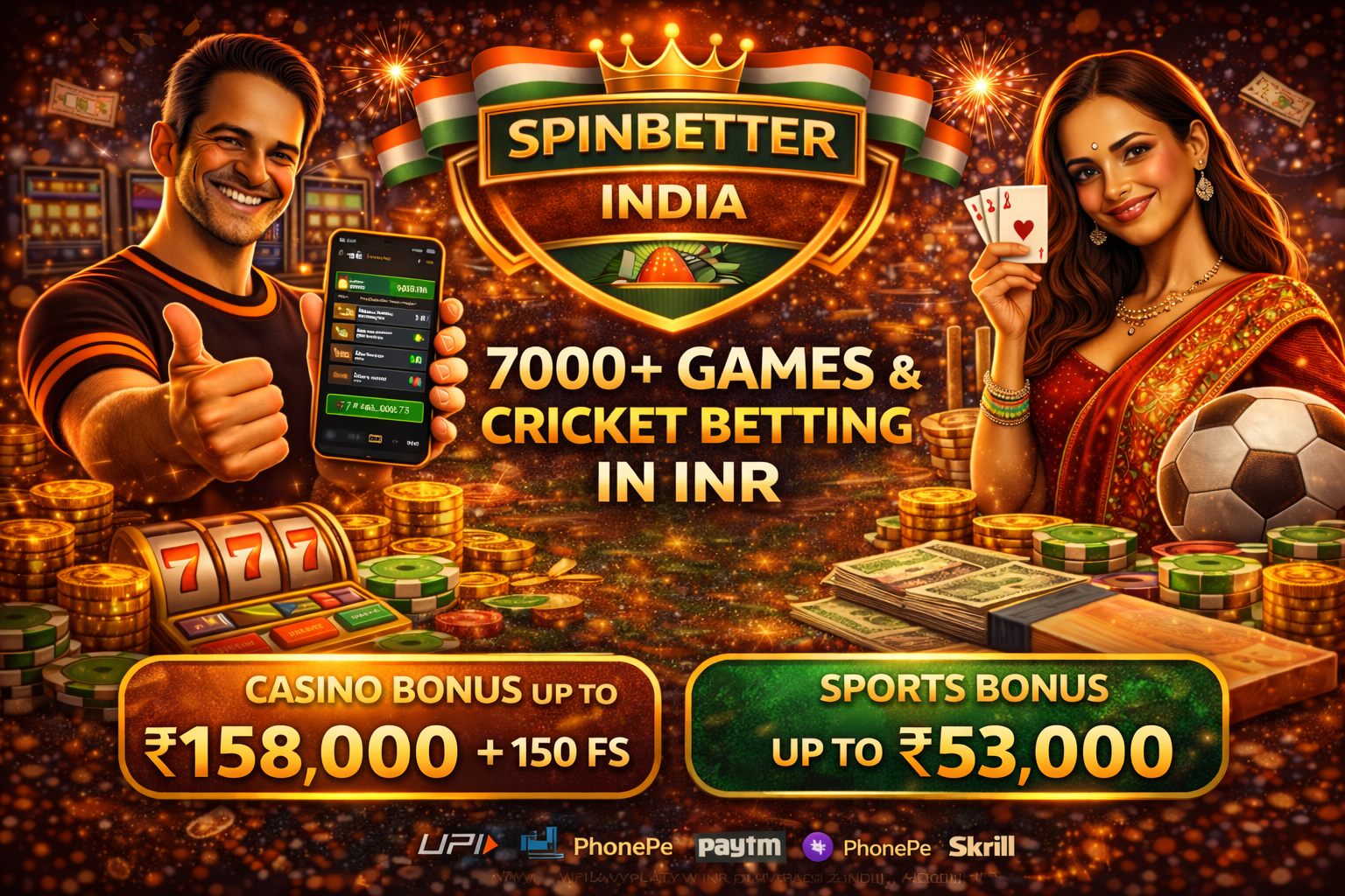 SpinBetter India is where cutting-edge technology meets genuine Indian hospitality. We have created a platform that understands you: here, 7,000+ games for every taste coexist with an extensive line of cricket and soccer betting, and all calculations are transparent and made in rupees. We have deliberately avoided complicated schemes and hidden conditions so that you can simply enjoy the thrill of the game. Start winning today! New players receive a welcome package of up to INR 158,000 + 150 free spins for the casino or up to INR 53,000 for sports betting. ๐ฐ
